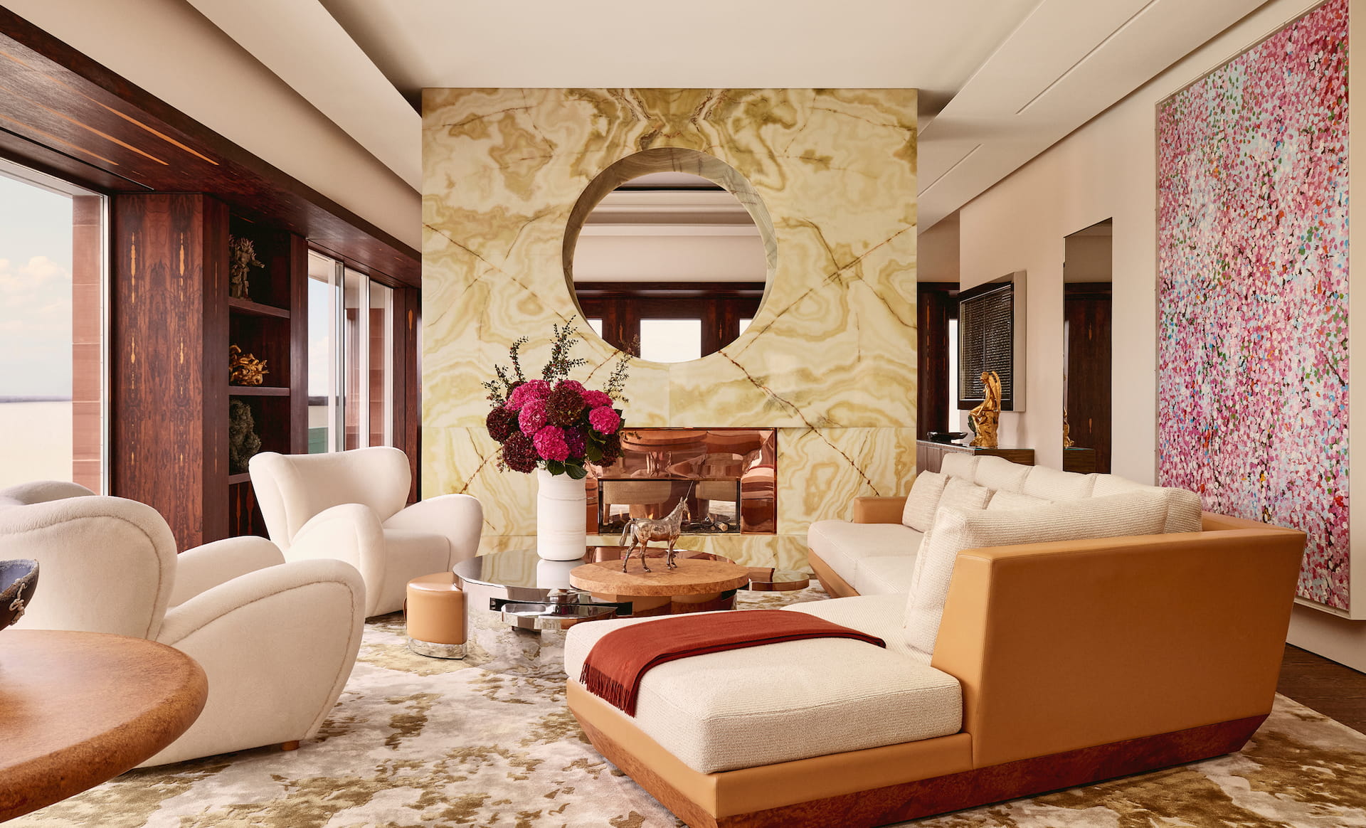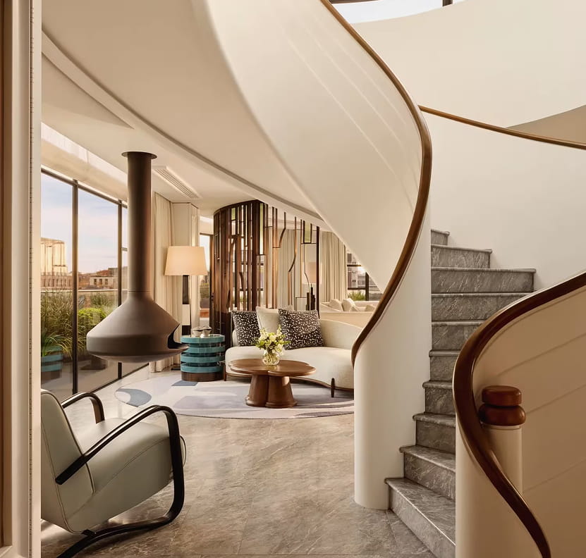 Wraparound terrace with dramatic Mayfair views defines this distinctive two-bedroom suite by Pierre-Yves Rochon. The octagonal design features curated artworks, bronze accents, Art Deco fireplace, and grand piano, with custom furnishings shaped to complement the suite's unique architectural lines.